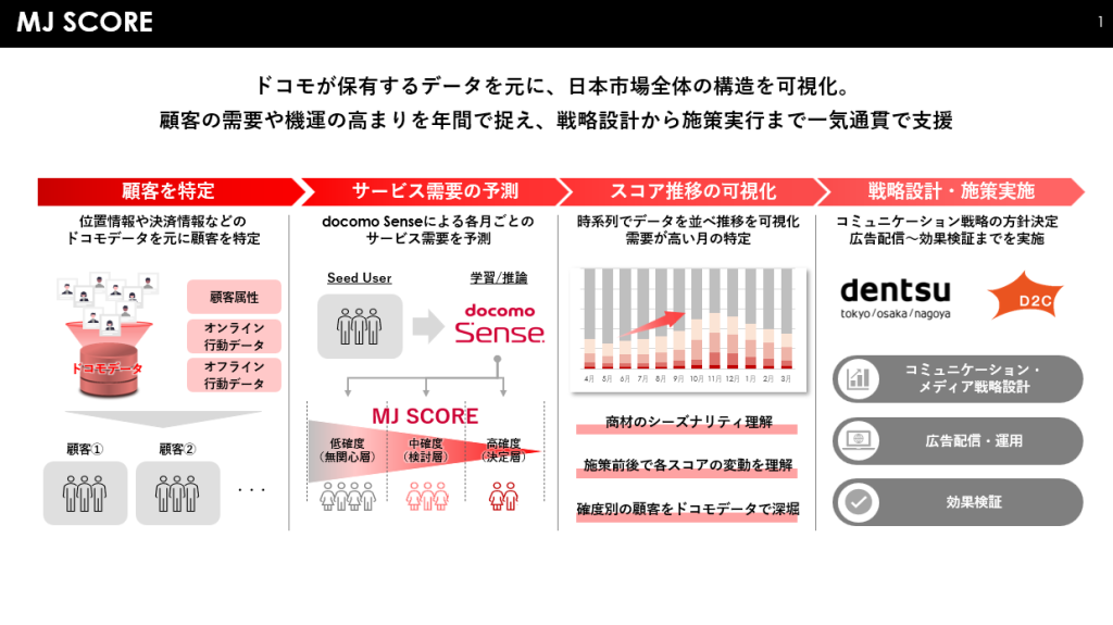 株式会社D2C(以下、D2C)、株式会社NTTドコモ(以下、ドコモ)、株式会社電通(以下、電通)は、企業のプロモーション施策を支援するマーケティングソリューション「MJ SCORE ™(Microcosm of Japan SCORE )」※1(以下、本ソリューション)を共同開発しました。本ソリューションは、2025年12月3日(水)から電通より提供を開始します。