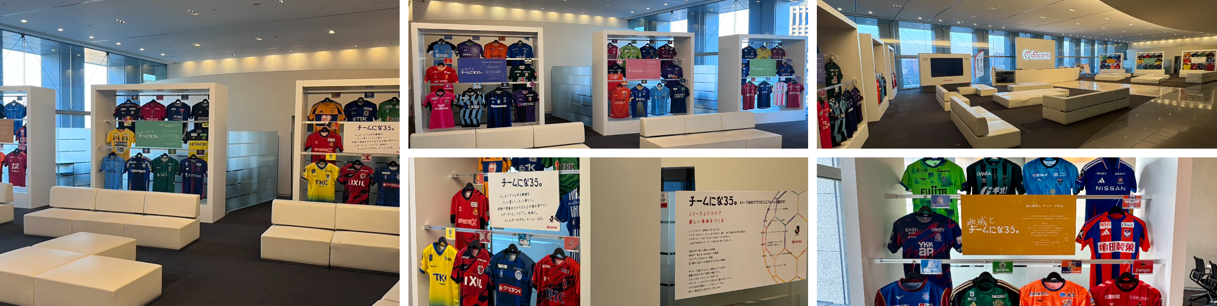 NTTドコモが掲げるJリーグとの協業ビジョン「チームになろう。」プロジェクトの一環として、本社受付フロアにJリーグ全60クラブのユニフォームを展示。クリエイティブのプランニングから、美術施工のディレクションを担当しました。